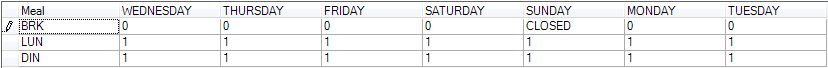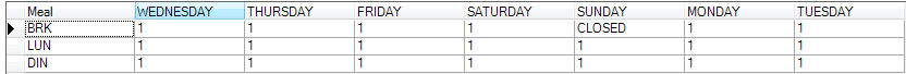 In Example 1, the location has 3 meal periods defined, so there should be 21 Use Switches to define. However, after looking at Sunday, it appears that the BRK meal is CLOSED. Which means that this location is never open for that meal period (as defined in Location Maintenance, "Always Closed").